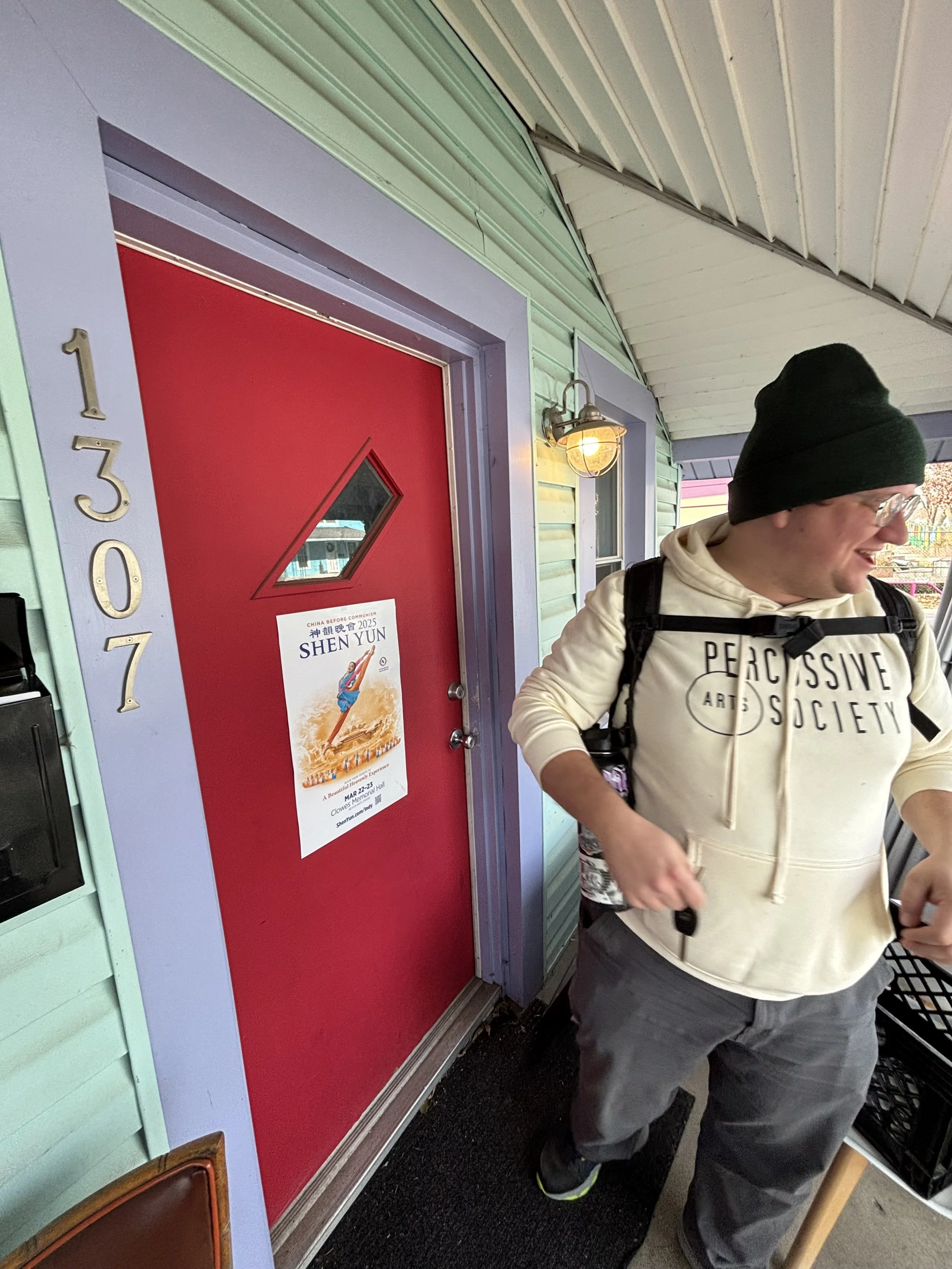 Another Indianapolis composer & friend Rob Funkhouser wonders how a Shen Yun poster made it to his front door, December 2024.